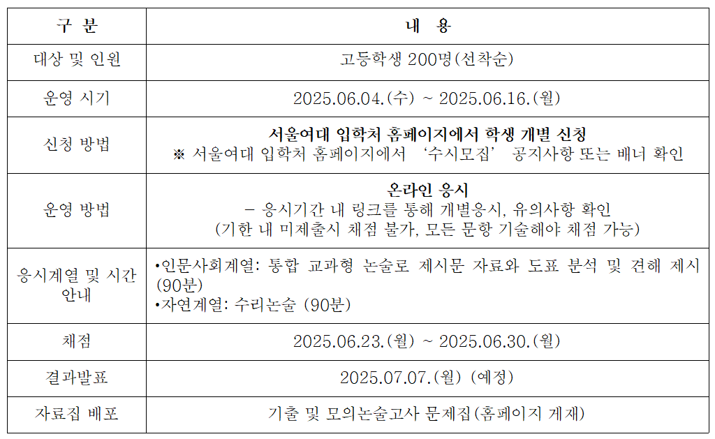 2025년 서울여자대학교 온라인 모의논술 참가 안내