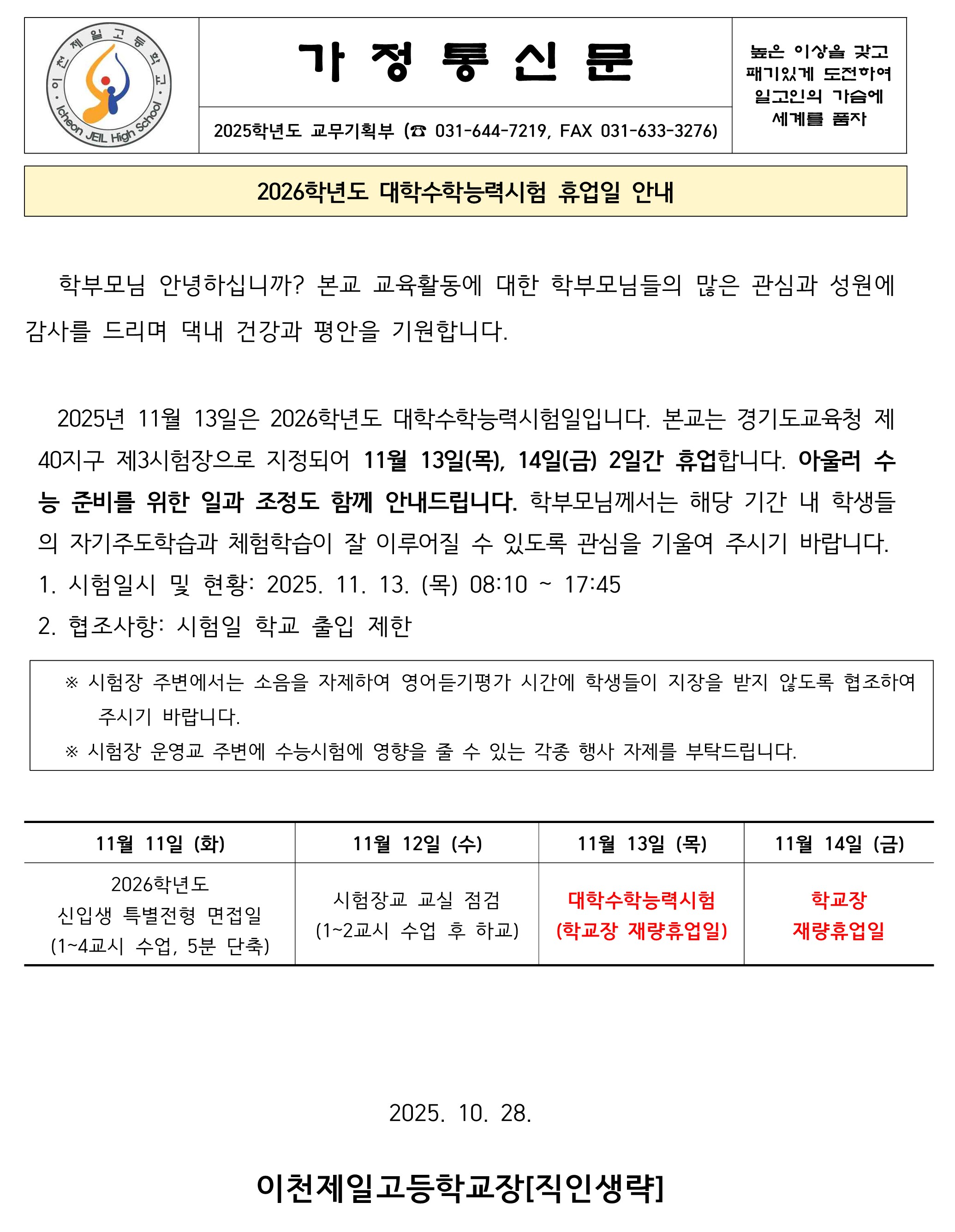 2026학년도 대학수학능력시험 휴업일 안내 가정통신문입니다.
