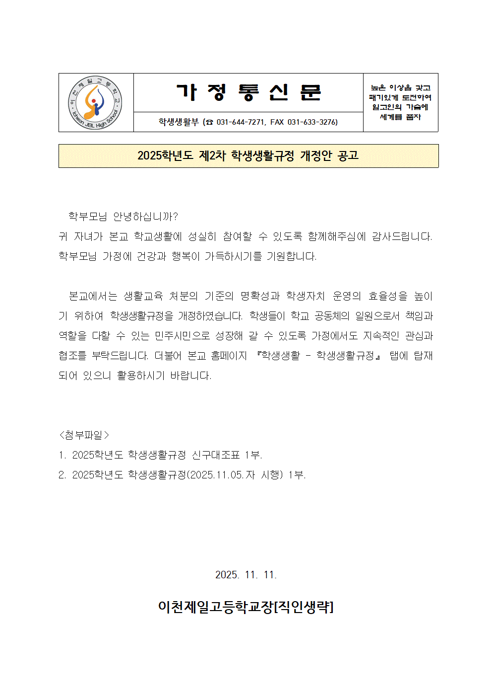 2025학년도 학생생활규정 개정 공포(2025.11.05.자 시행)