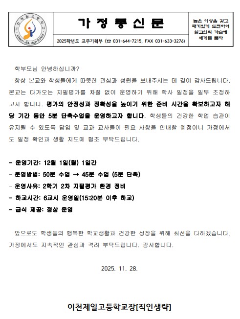 2025년 12월 1일(월) 5분 단축수업에 대한 안내드립니다.